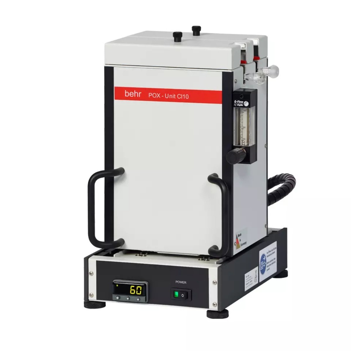 Принцип работы модуля POX 10 заключается в одновременной обработке двух проб воды объёмом по 100 мл, каждая из которых помещается в реакционную пробирку с избытком порошкообразного свинца; пробирки напрямую подключены к газоводу печи анализатора CL 10, где в ходе нагрева летучие галогенированные углеводороды удаляются из водной фазы потоком газа и поступают в камеру сгорания, нагретую до 950 °C, для полной минерализации с последующим кулонометрическим определением высвободившихся галогенид-ионов.