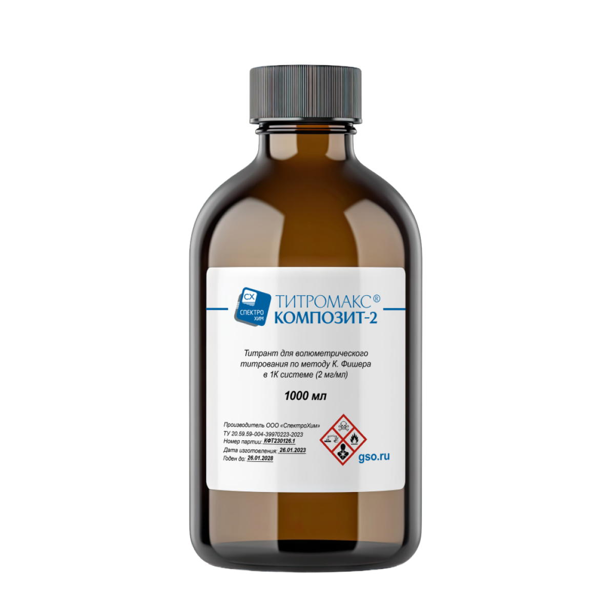 Титрант «Титромакс Композит-2» от «СпектроХим» представляет собой готовый к применению однокомпонентный реактив для точного определения содержания воды по методу волюметрического титрования Карла Фишера. Реактив имеет вид жидкости интенсивного тёмно-фиолетового цвета и обладает полной растворимостью в воде, что обеспечивает удобство работы и точное дозирование. Его ключевой характеристикой является стандартизированный титр, составляющий 2 мг воды на 1 мл раствора, что позволяет проводить точные количественные расчёты.