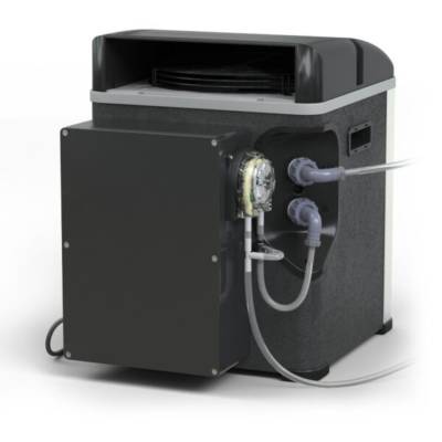 На дисплее спереди отображается состояние функции охлаждения и температура воды в устройстве. Температуру воды можно установить в диапазоне от 5 до 30 °C с помощью кнопок на боковой панели. Насосный агрегат и главный выключатель агрегата расположены в задней части агрегата. Объемный расход самовсасывающего перистальтического насоса можно регулировать с помощью регулировочного колеса.