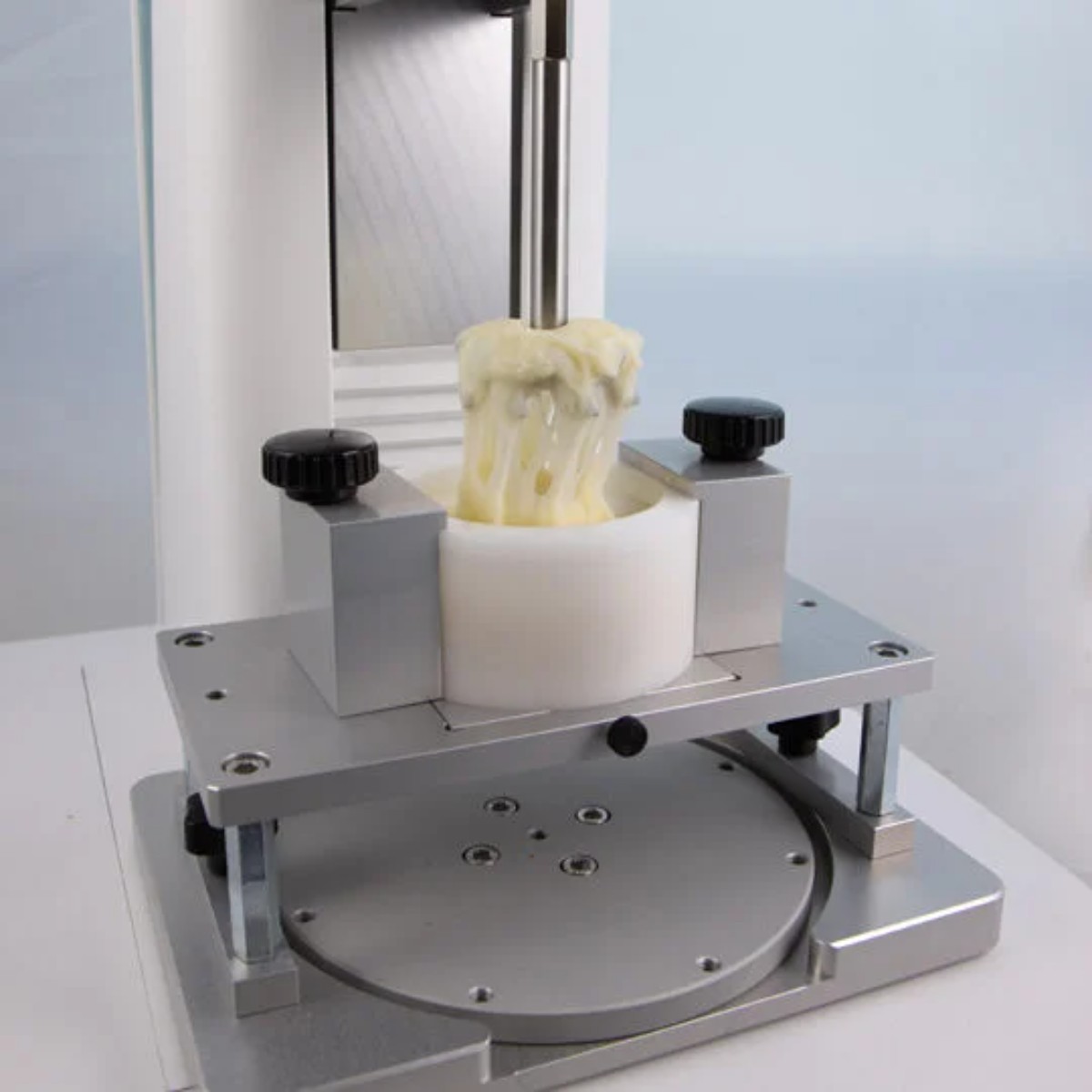 Стенд Lamy Rheology TX-CEF представляет собой специализированное приспособление для объективного количественного анализа такого ключевого для плавленых сыров свойства, как растяжимость (тягучесть). Данное решение предназначено для точного измерения деформационных характеристик сырной массы, имитируя процесс ее растяжения, который визуально наблюдается при отделении кусочка от горячей пиццы или бутерброда. Получаемые данные позволяют количественно оценить усилие, необходимое для растяжения, и длину, на которую образец способен удлиниться до разрыва, что напрямую коррелирует с органолептическим восприятием текстуры потребителем.