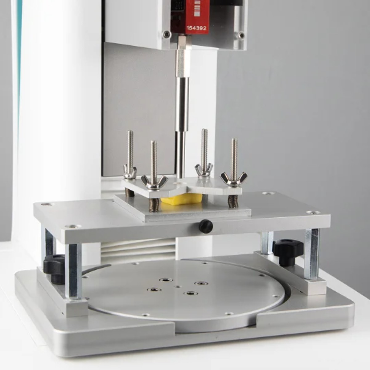Принцип работы стенда основан на точном измерении усилия, необходимого для введения зонда (иглы, цилиндра или сферы) в предварительно закрепленный образец. Кондитерское изделие помещается в специальную ячейку или на опорную площадку стенда TX-CPF, который затем надежно фиксируется на универсальном столе TX-FBT (приобретается отдельно). Это обеспечивает полную неподвижность образца во время теста, что является критически важным условием для получения точных и воспроизводимых результатов. В держатель анализатора текстуры, например TX-700 или TX-900, устанавливается выбранный зонд.