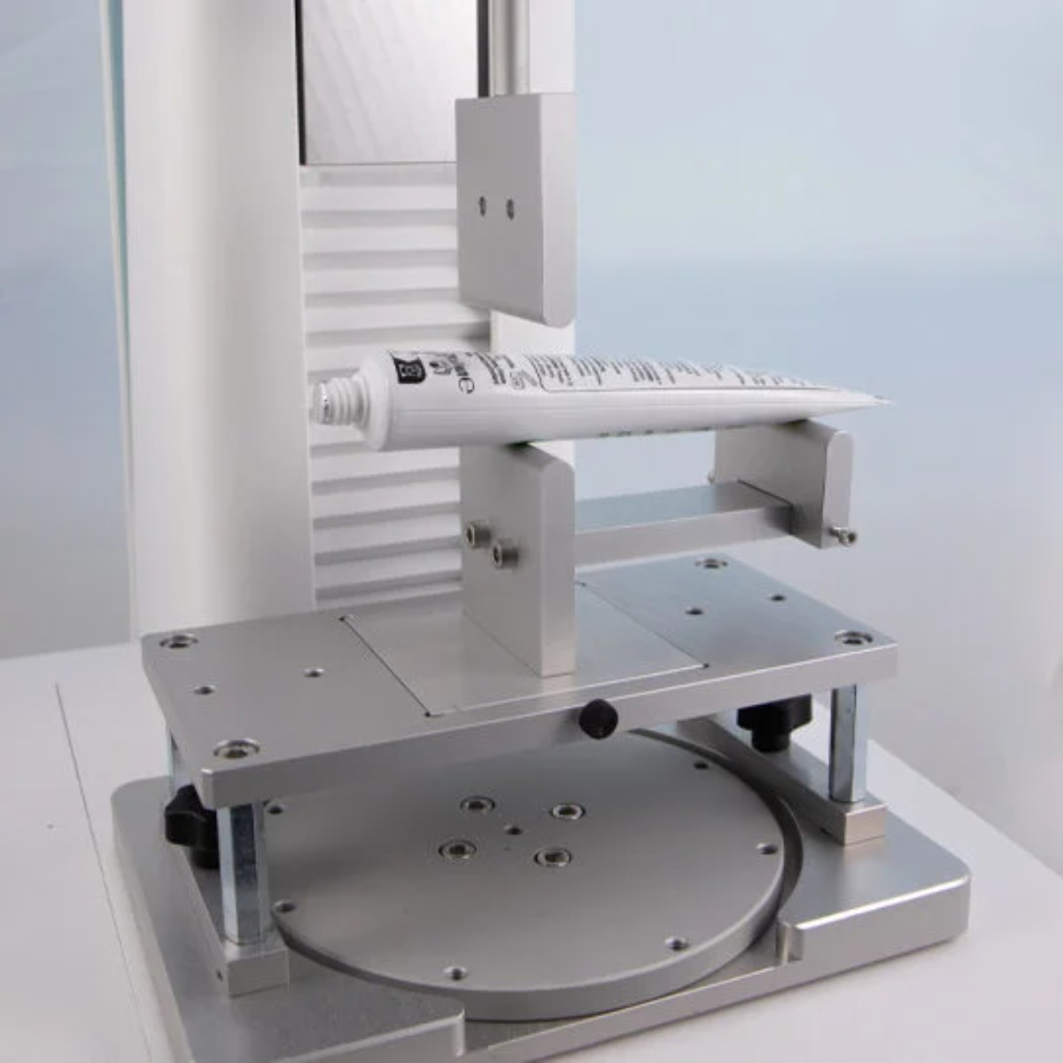 Принцип работы стенда основан на имитации ручного выдавливания с регистрацией прилагаемого усилия. Для проведения испытания тюбик надежно фиксируется в горизонтальном положении на универсальном столе TX-FBT (приобретается отдельно), который обеспечивает его полную неподвижность во время теста. Стенд TX-TEF закрепляется в держателе анализатора текстуры, например TX-700 или TX-900.