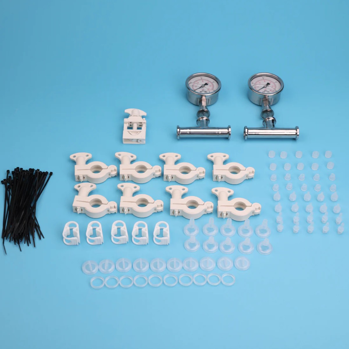 Он включает в себя необходимые компоненты, такие как соединители и фитинги, силиконовые трубки, зажимные хомуты и манометры, обеспечивающие надежную и герметичную сборку: