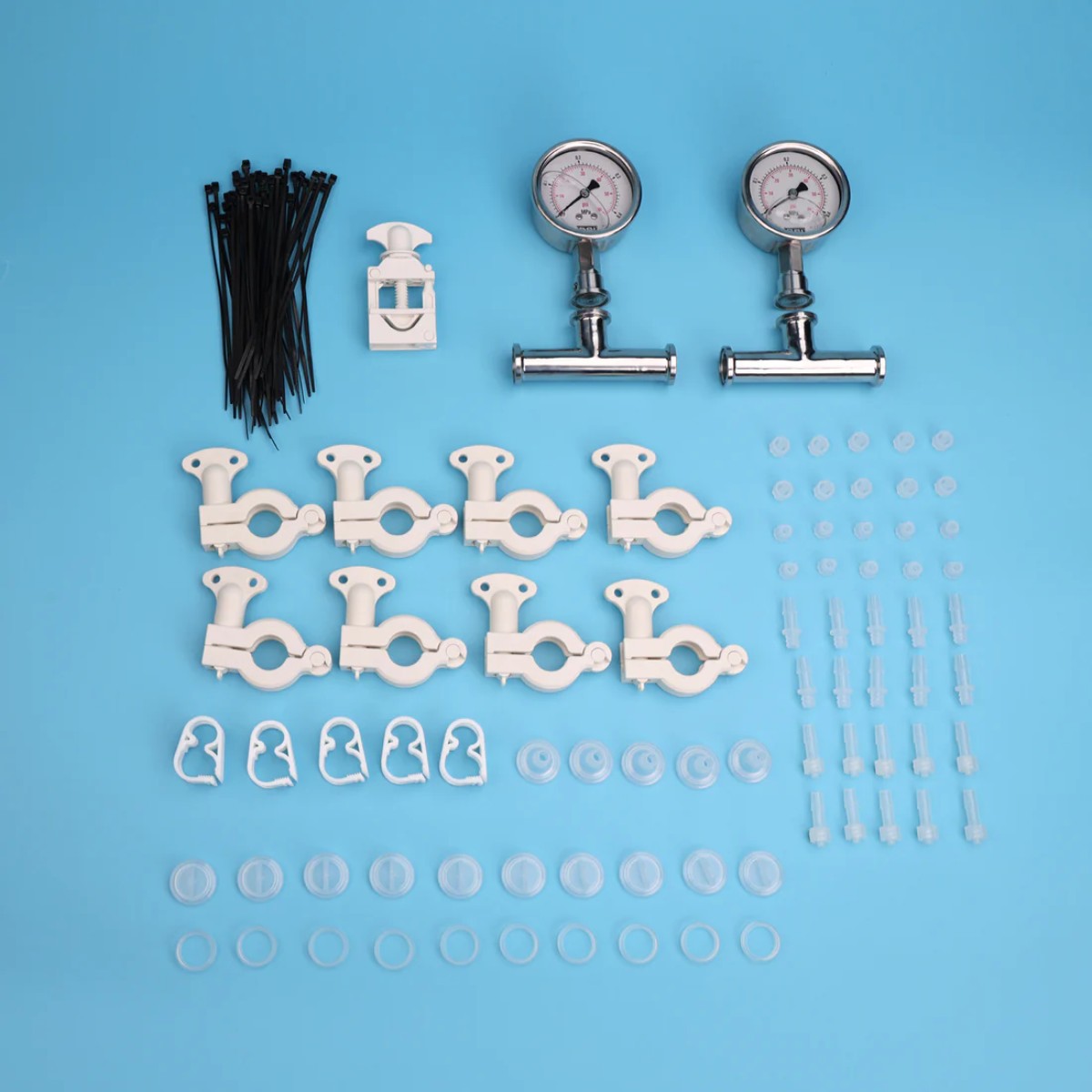 Он включает в себя необходимые компоненты, такие как соединители и фитинги, силиконовые трубки, зажимные хомуты и манометры, обеспечивающие надежную и герметичную сборку: