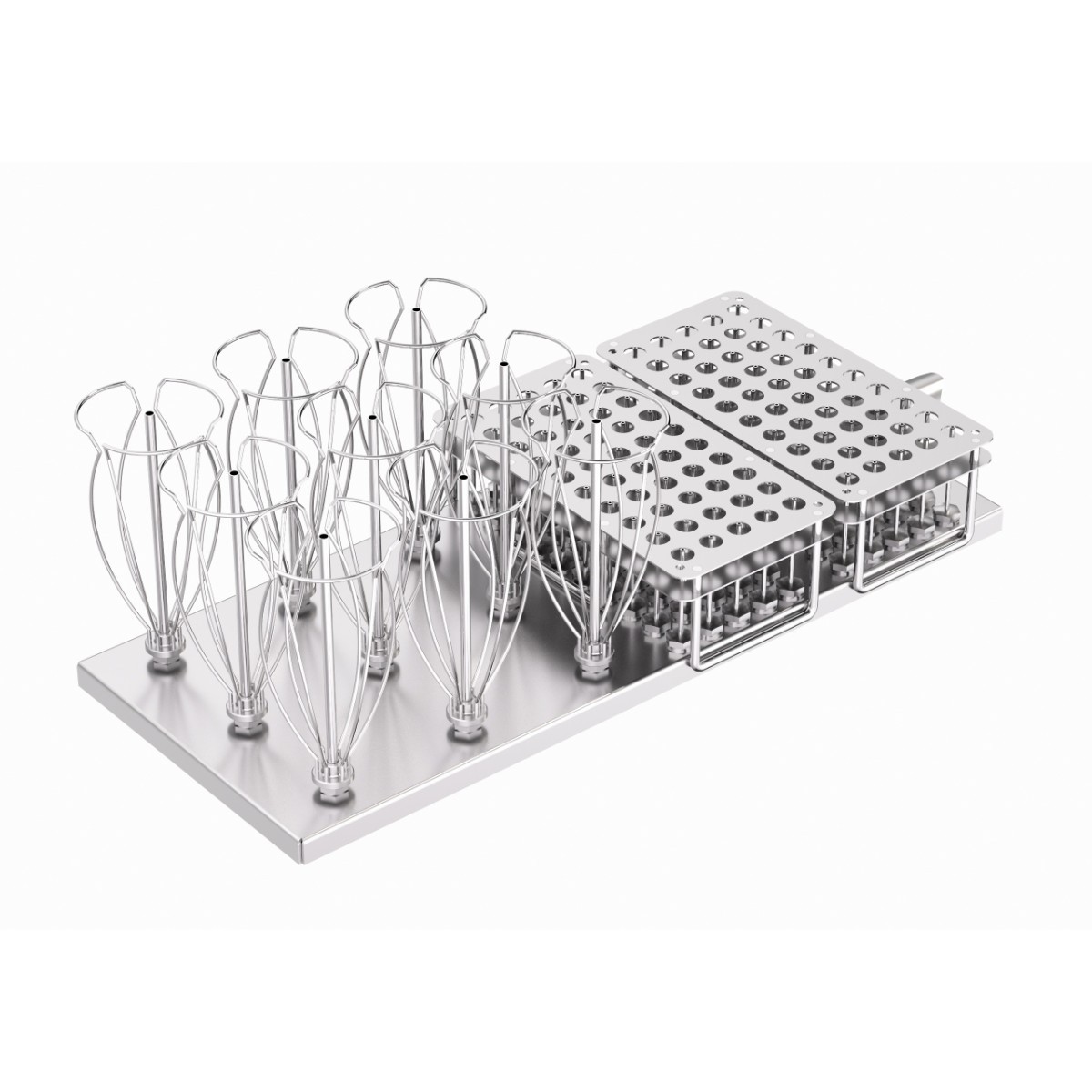 Такая смешанная конфигурация позволяет эффективно обрабатывать разнородную лабораторную посуду за один цикл мойки, что особенно ценно в лабораториях с широким ассортиментом используемой посуды.