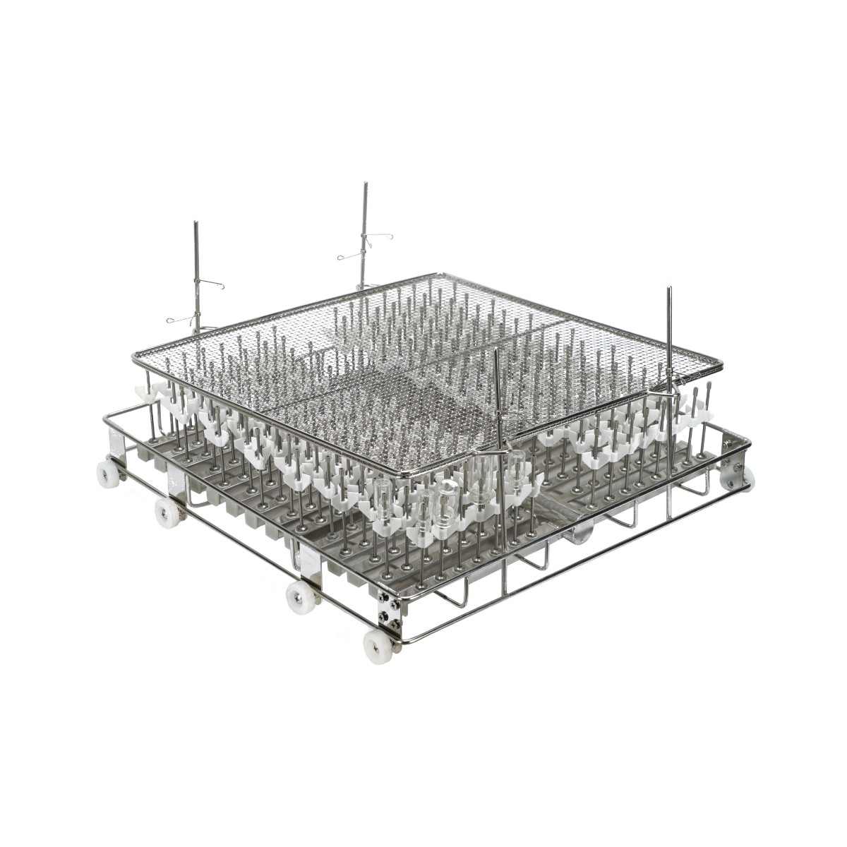 Данная 260-позиционная стойка специально разработана для очистки пробирок, флаконов для инъекций и соответствующих крышек. Конструкция включает 260 инжекционные распылительные трубки, которые обеспечивают направленную подачу моющих и ополаскивающих растворов внутрь каждой пробирки или флакона, и регулируемые кронштейны для надежной фиксации посуды различных размеров.
