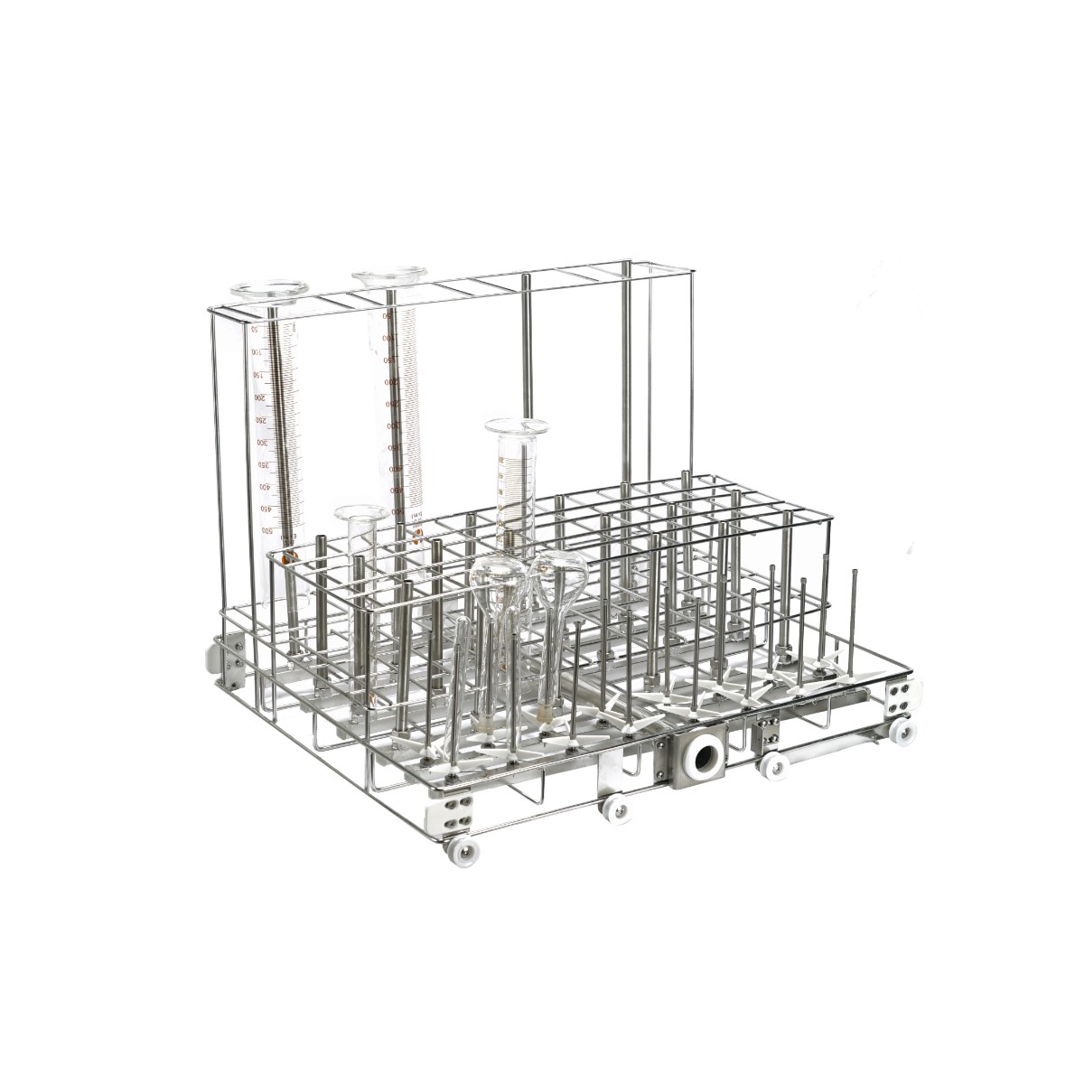 Данная 38-позиционная стойка разработана специально для очистки градуированных мерных цилиндров — высокоточных лабораторных емкостей, требующих особо бережного и тщательного ухода. Конструкция стойки обеспечивает надежную фиксацию каждого мерного цилиндра в вертикальном положении, предотвращая его смещение, опрокидывание и столкновение с соседними емкостями под давлением воды и при высоких температурах в процессе мойки.