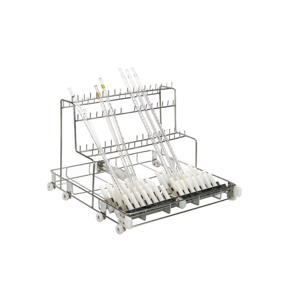 Конструкция стойки обеспечивает надежную фиксацию каждой пипетки в вертикальном положении, предотвращая их смещение, изгиб, опрокидывание и столкновение друг с другом под давлением воды и при высоких температурах в процессе мойки.