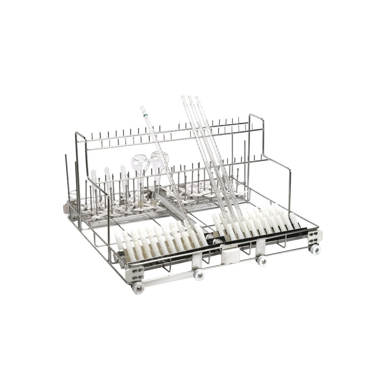 Конструкция стойки включает 60 позиций для объемных пипеток различных типов и 30 позиций с распылительными колонками для инжекционной очистки колб и другой полой посуды. Такая комбинированная конфигурация позволяет одновременно обрабатывать до 60 пипеток и до 30 колб или подобных емкостей за один цикл мойки, что значительно повышает производительность лабораторных процессов.