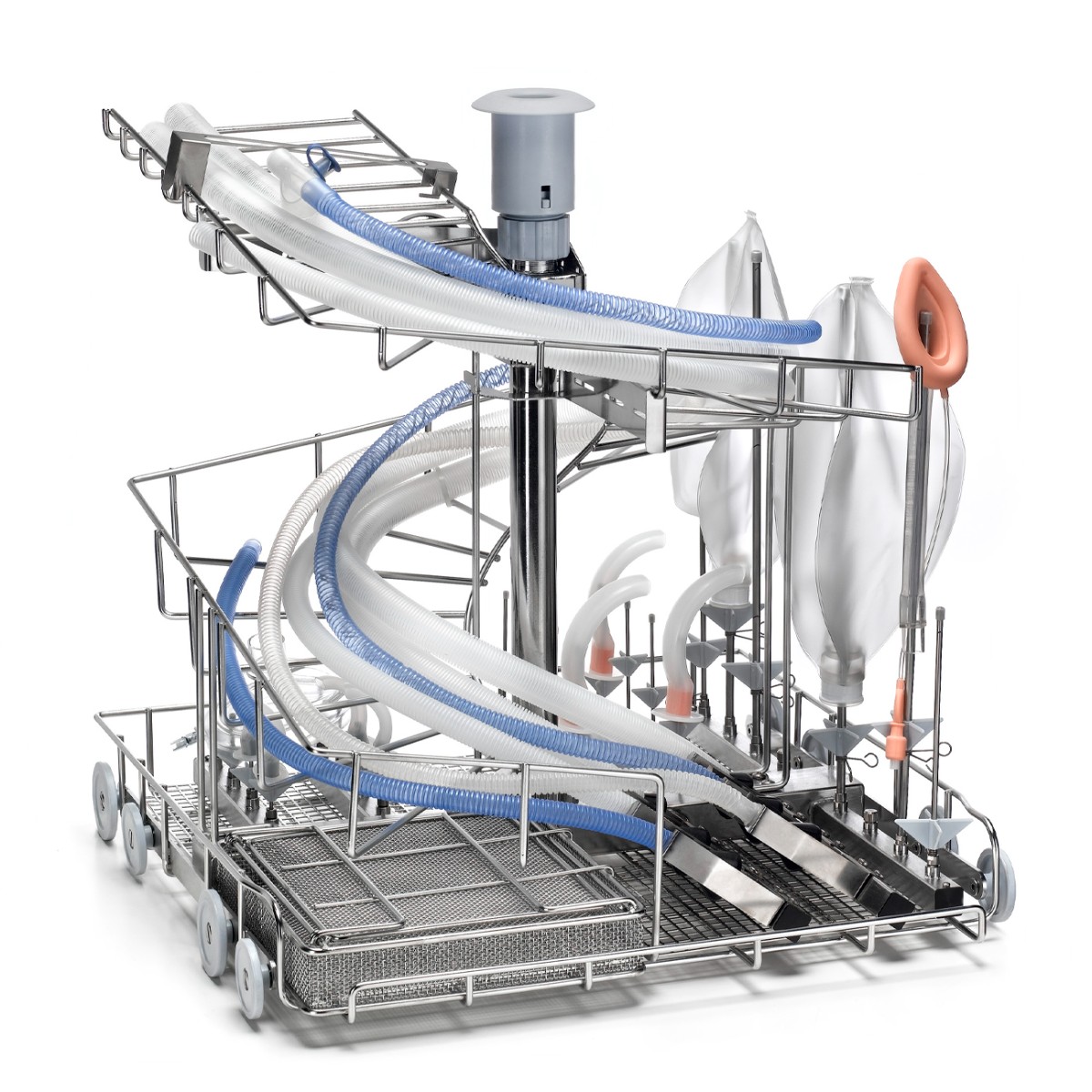 Основные функции мойки включают обработку катетеров, масок, колб, наборов для анестезии, а также гофрированных трубок. Конструкция вставки обеспечивает надежную фиксацию каждого типа изделий: катетеры и гофрированные трубки закрепляются так, чтобы моющий раствор свободно проходил через их внутренние полости; маски и колбы фиксируются в устойчивом положении для равномерного омывания всех поверхностей; наборы для анестезии размещаются с учетом их хрупких соединений.
