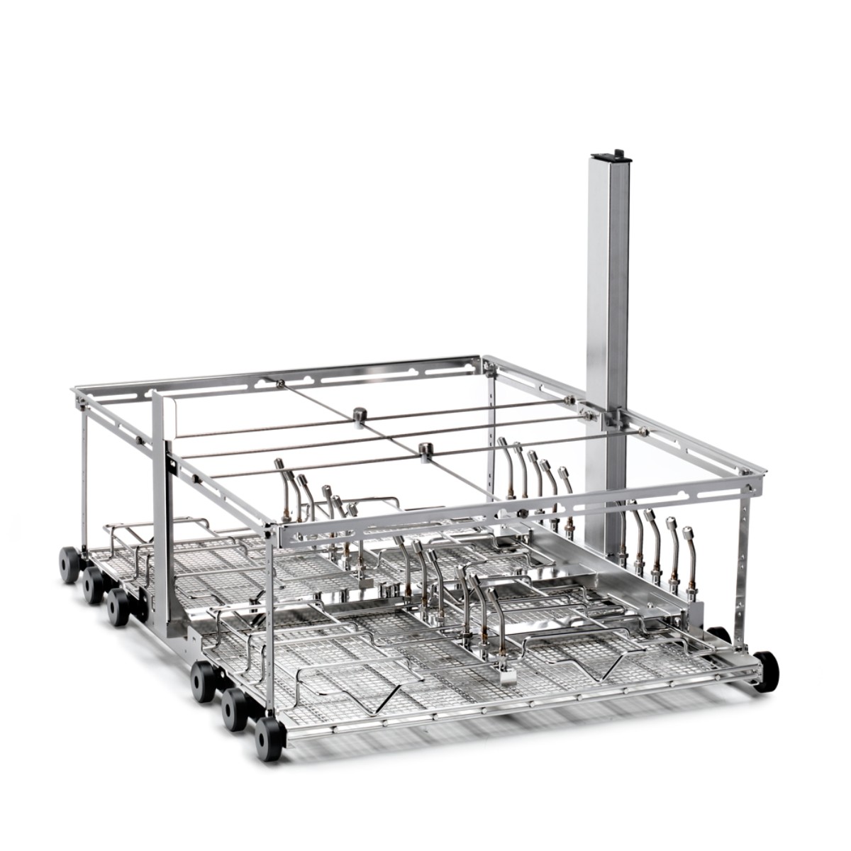 Благодаря передвижной конструкции установку легко перемещать внутри рабочей камеры термодезинфектора, а также удобно транспортировать между зонами подготовки, обработки и хранения. Установка выполнена из коррозионно-стойких материалов, устойчивых к воздействию агрессивных моющих средств и высоких температур, что гарантирует долговечность и надежность даже при интенсивной ежедневной эксплуатации в медицинских и лабораторных учреждениях.