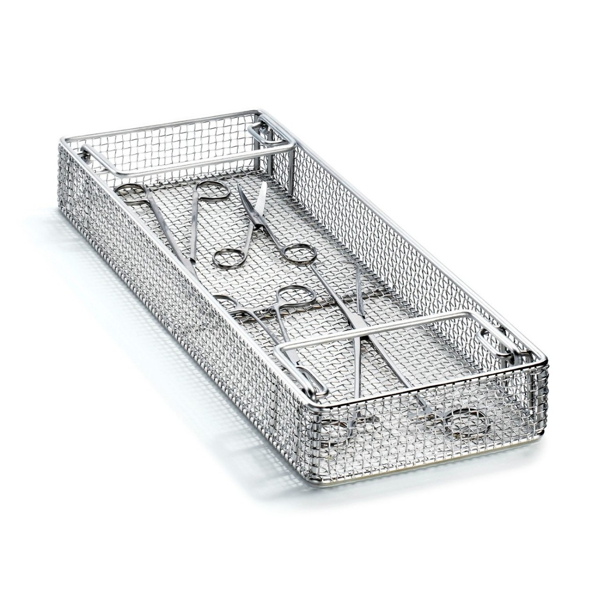 Данная модель подходит для широкого спектра хирургических инструментов, включая ножницы, зажимы, щипцы и другие металлические изделия. Размер ячейки сетки составляет 5×5 мм, что обеспечивает надёжную фиксацию даже небольших инструментов, предотвращая их выпадение через сетку, и в то же время позволяет моющему и дезинфицирующему раствору свободно циркулировать вокруг каждого предмета для равномерной очистки со всех сторон. Она выполнена из высококачественной нержавеющей стали, устойчивой к коррозии, агрессивным моющим средствам и высоким температурам, что гарантирует долгий срок службы даже при интенсивной ежедневной эксплуатации.