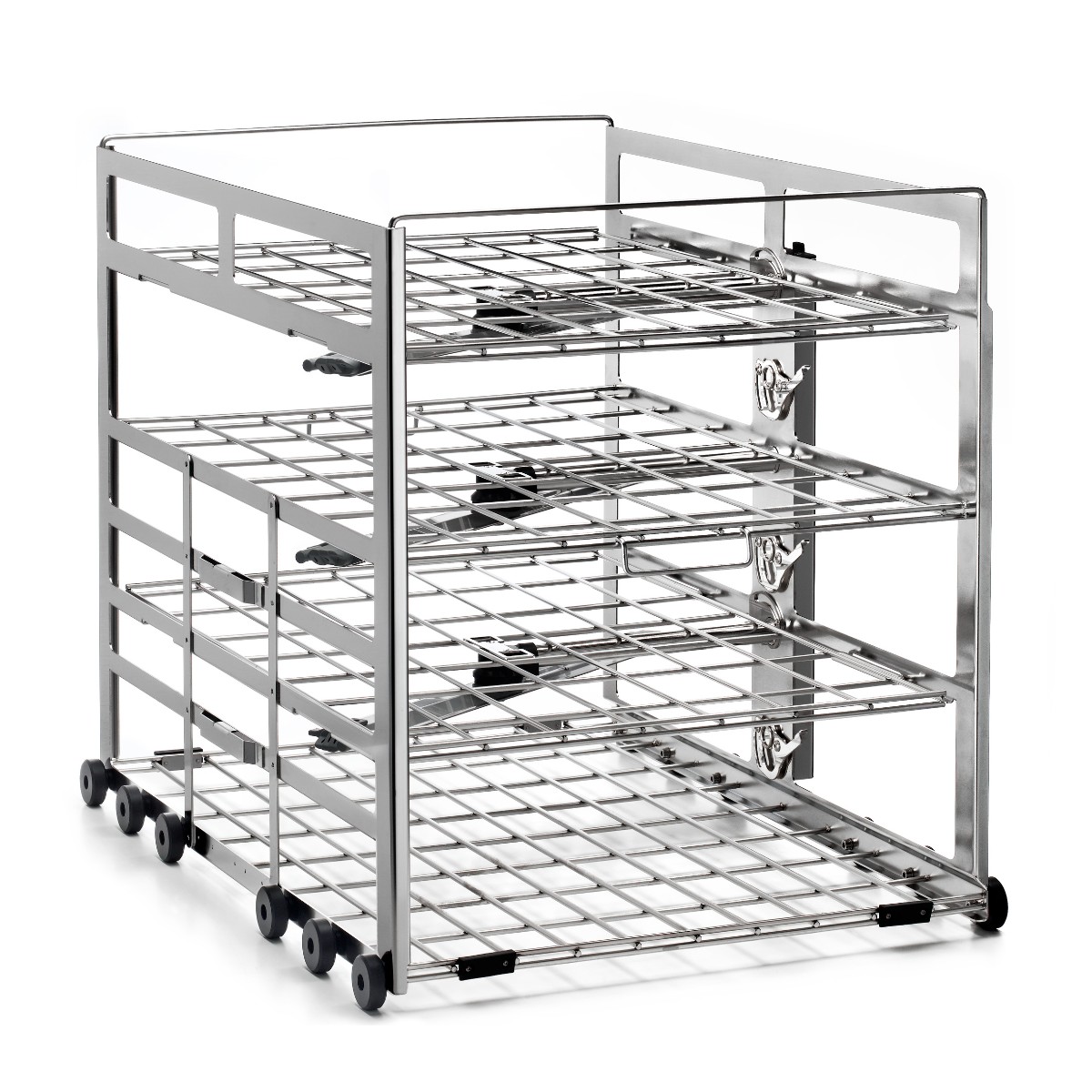 Тележка рассчитана на одновременное размещение до 12 корзин, которые распределяются по 4 уровням. Такая многоуровневая конструкция позволяет эффективно использовать вертикальное пространство, разделять разные типы инструментов и принадлежностей по отдельным ярусам, а также удобно организовывать их хранение и транспортировку между операционными, стерилизационными и складскими помещениями.