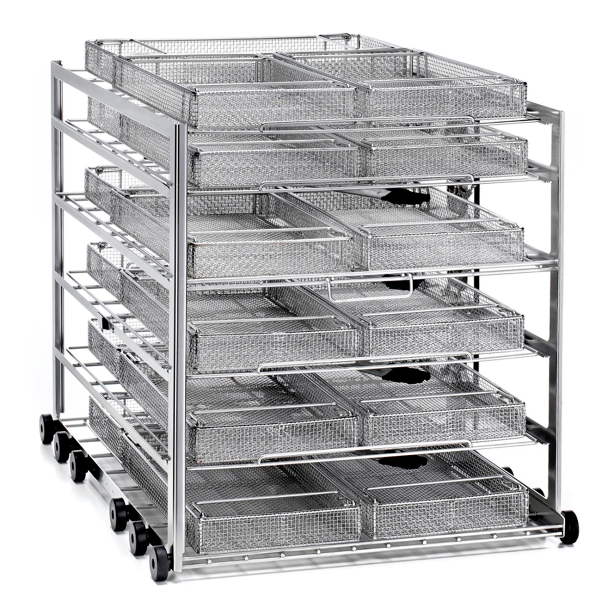 Тележка рассчитана на одновременное размещение до 18 корзин, которые распределяются по 6 уровням. Такая многоуровневая конструкция позволяет эффективно использовать вертикальное пространство, разделять разные типы инструментов и принадлежностей по отдельным ярусам, а также удобно организовывать их хранение и транспортировку между операционными, стерилизационными и складскими помещениями.