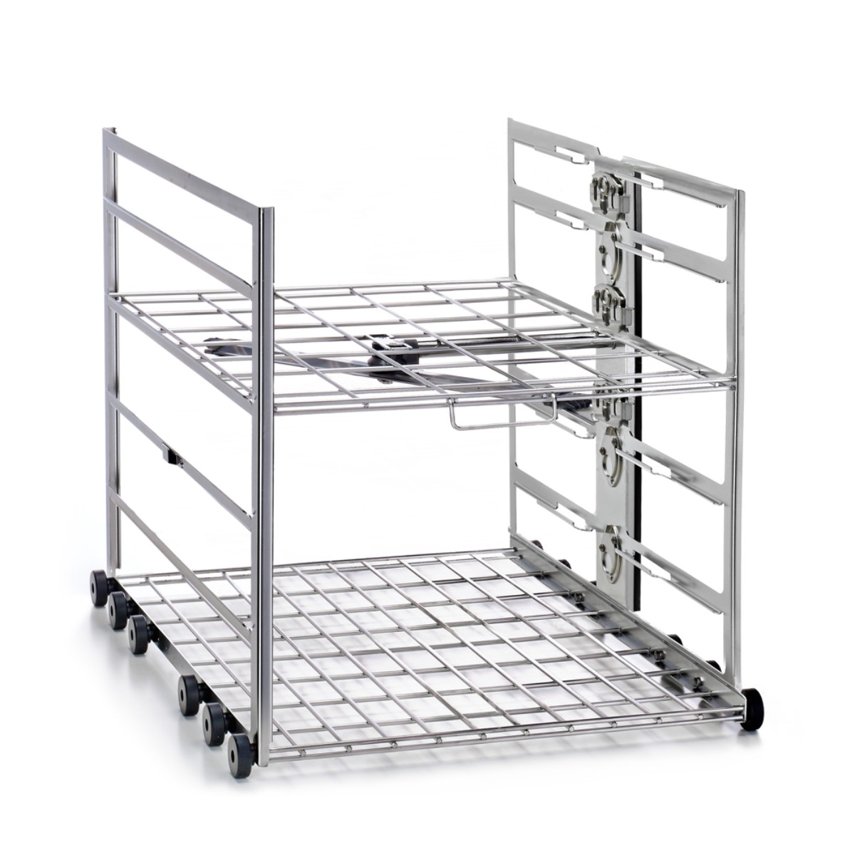Тележка рассчитана на одновременное размещение до 18 корзин, которые распределяются по 2 уровням. Такая многоуровневая конструкция позволяет эффективно использовать вертикальное пространство, разделять разные типы инструментов и принадлежностей по отдельным ярусам, а также удобно организовывать их хранение и транспортировку между операционными, стерилизационными и складскими помещениями.