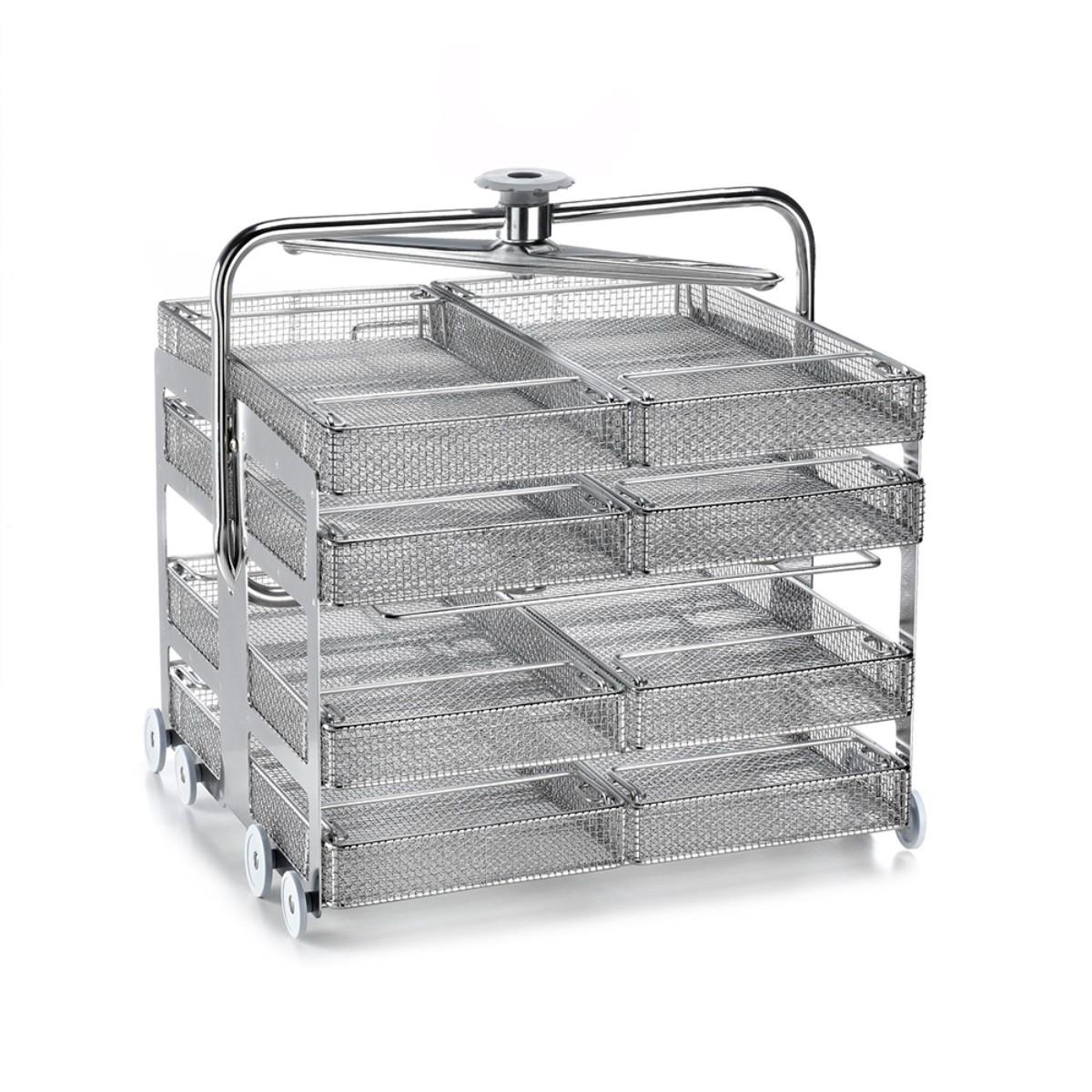 Установка используется вместе с корзиной CSKDIN, в которую загружают инструменты. За один цикл можно обработать до 8 таких корзин. Устройство устанавливается на нижний уровень моечной или дезинфицирующей машины — там обычно самый сильный напор воды, что хорошо для удаления загрязнений.
