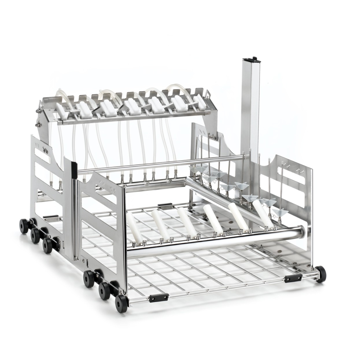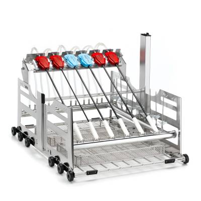 Данная модель разработана с учетом особых требований к очистке и дезинфекции высокоточных роботизированных инструментов. Модуль рассчитан на одновременное размещение до 6 инструментов диаметром от 5 до 8 мм. Конструкция обеспечивает надежную фиксацию каждого инструмента в индивидуальном посадочном месте, предотвращая их соприкосновение, смещение и возможные механические повреждения во время цикла обработки.