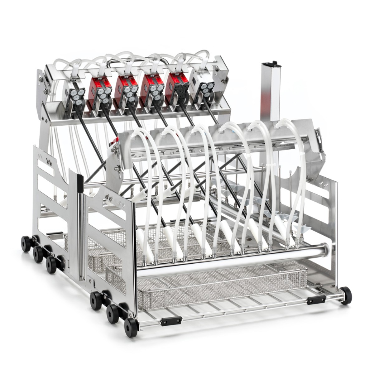 Модуль предусматривает 2 уровня стирки, что позволяет организовать двухъярусную обработку инструментов. Такая конфигурация обеспечивает равномерное и тщательное омывание как наружных поверхностей, так и труднодоступных участков каждого инструмента за счет оптимального распределения моющего раствора по обоим уровням. Модуль выполнен из высококачественных материалов, устойчивых к коррозии, агрессивным моющим средствам и высоким температурам, что гарантирует долговечность и надежность даже при интенсивной ежедневной эксплуатации в условиях роботизированных операционных.