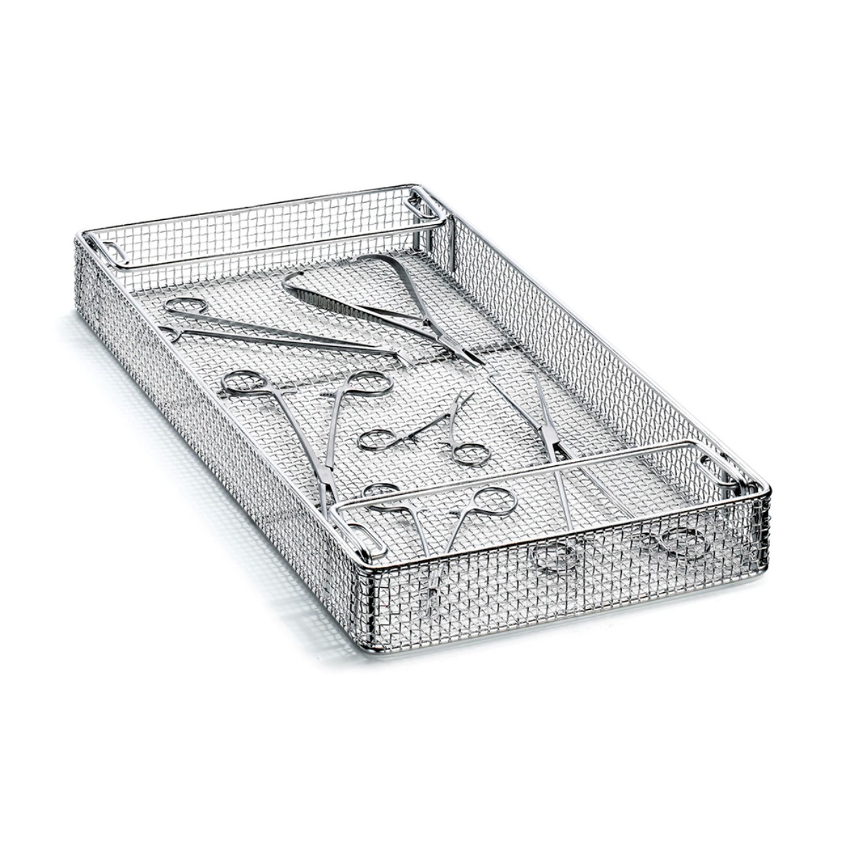Данная модель подходит для широкого спектра хирургических инструментов, включая ножницы, зажимы, щипцы и другие металлические изделия. Размер ячейки сетки составляет 5×5 мм, что обеспечивает надёжную фиксацию даже небольших инструментов, предотвращая их выпадение через сетку, и в то же время позволяет моющему и дезинфицирующему раствору свободно циркулировать вокруг каждого предмета для равномерной очистки со всех сторон.