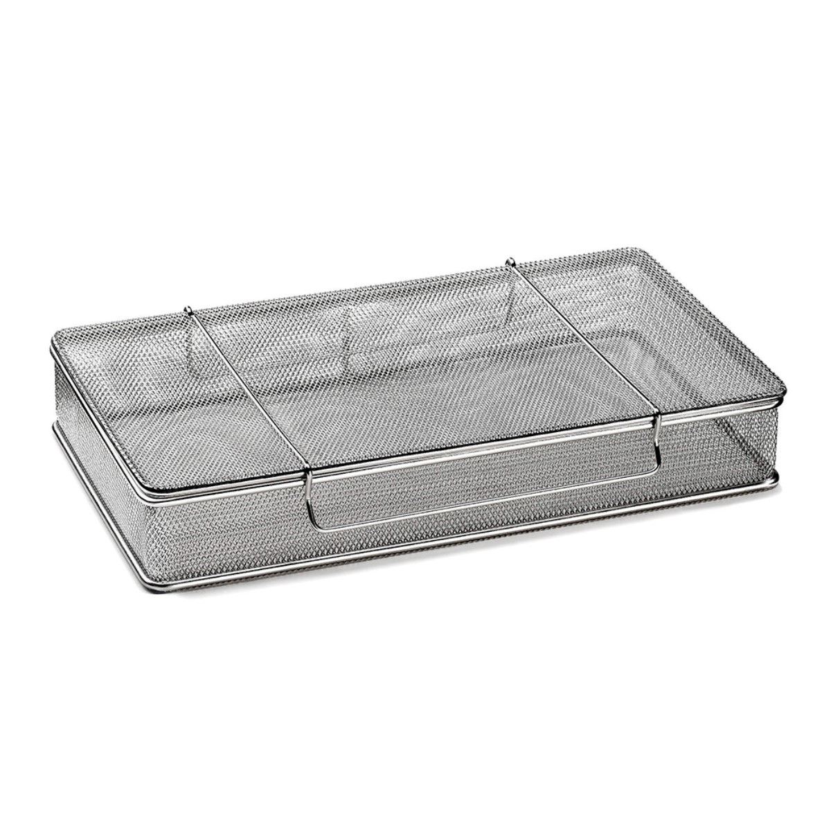 Ключевая особенность данной модели — наличие крышки, которая надежно фиксирует мелкие и хрупкие инструменты внутри лотка, предотвращая их выпадение, смещение или повреждение во время цикла обработки. Размер ячейки сетки составляет всего 2×2 мм, что особенно важно для работы с микроинструментами: такая мелкая ячейка не позволяет даже самым маленьким элементам проваливаться сквозь сетку, при этом обеспечивая свободную циркуляцию моющих и дезинфицирующих растворов, а также горячего воздуха для сушки.