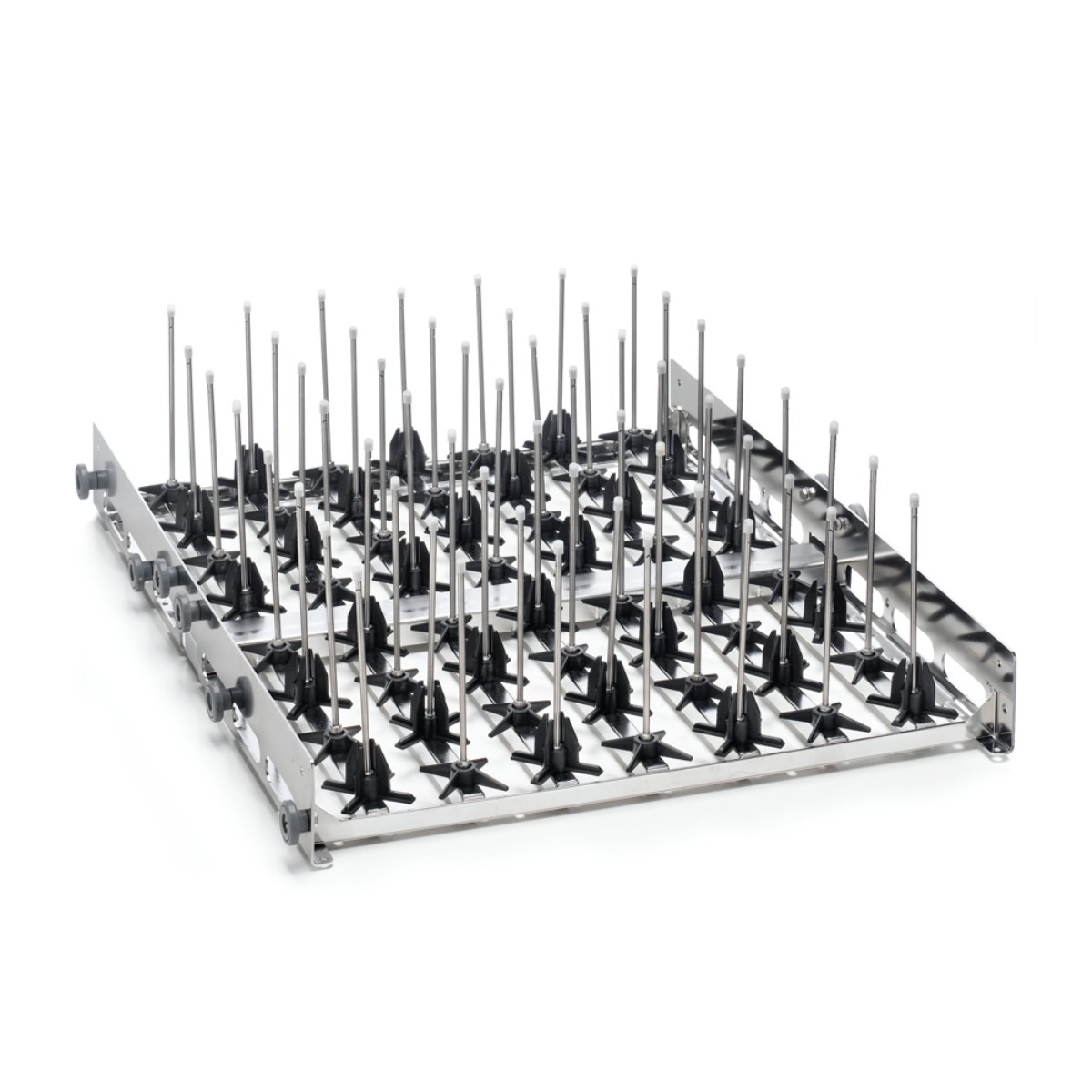 Данный модуль поставляется в комплекте с 56 соплами (форсунками), которые обеспечивают направленную подачу моющего раствора под давлением внутрь обрабатываемых предметов. Благодаря такому количеству сопел модуль способен одновременно подключать до 56 единиц лабораторной посуды, требующих инжекторной мойки — например, колб, мерных цилиндров, пробирок или других полых изделий с узким горлом.