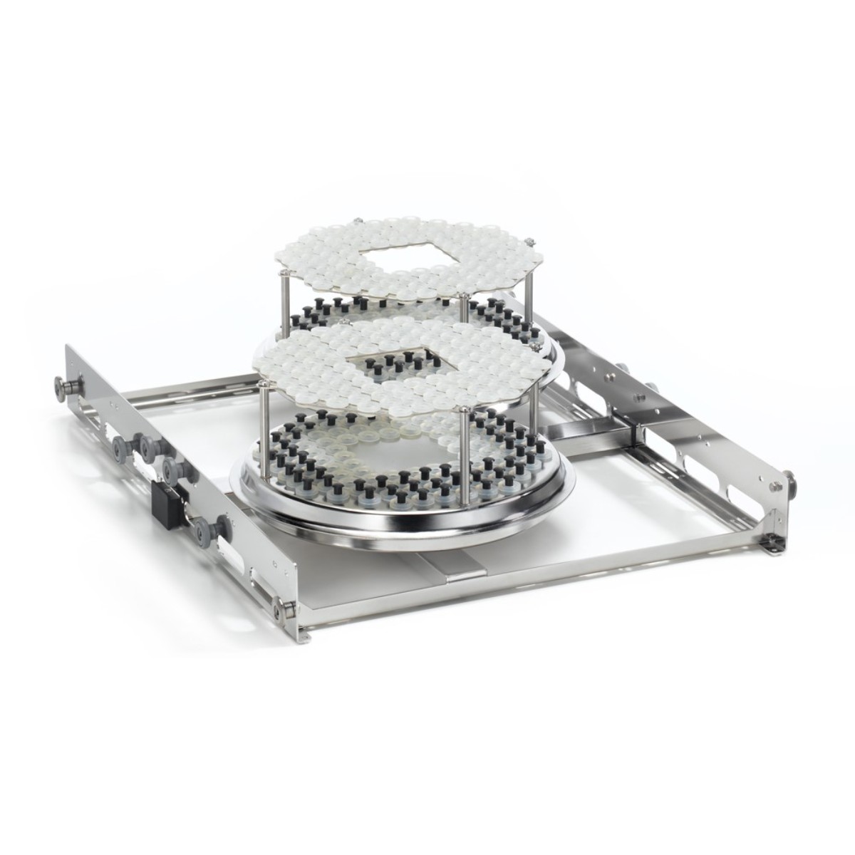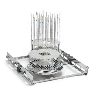 Ключевой особенностью конструкции является наличие встроенного коллектора для пипеток, рассчитанного на 208 позиций. Это означает, что вставка оборудована специальным устройством (коллектором), которое позволяет одновременно закрепить и мыть до 70 пипеток. Коллектор обеспечивает подачу моющего раствора внутрь каждой пипетки через индивидуальные сопла или каналы, что гарантирует тщательное удаление загрязнений с внутренних стенок — наиболее критичной зоны для точных измерительных приборов.
