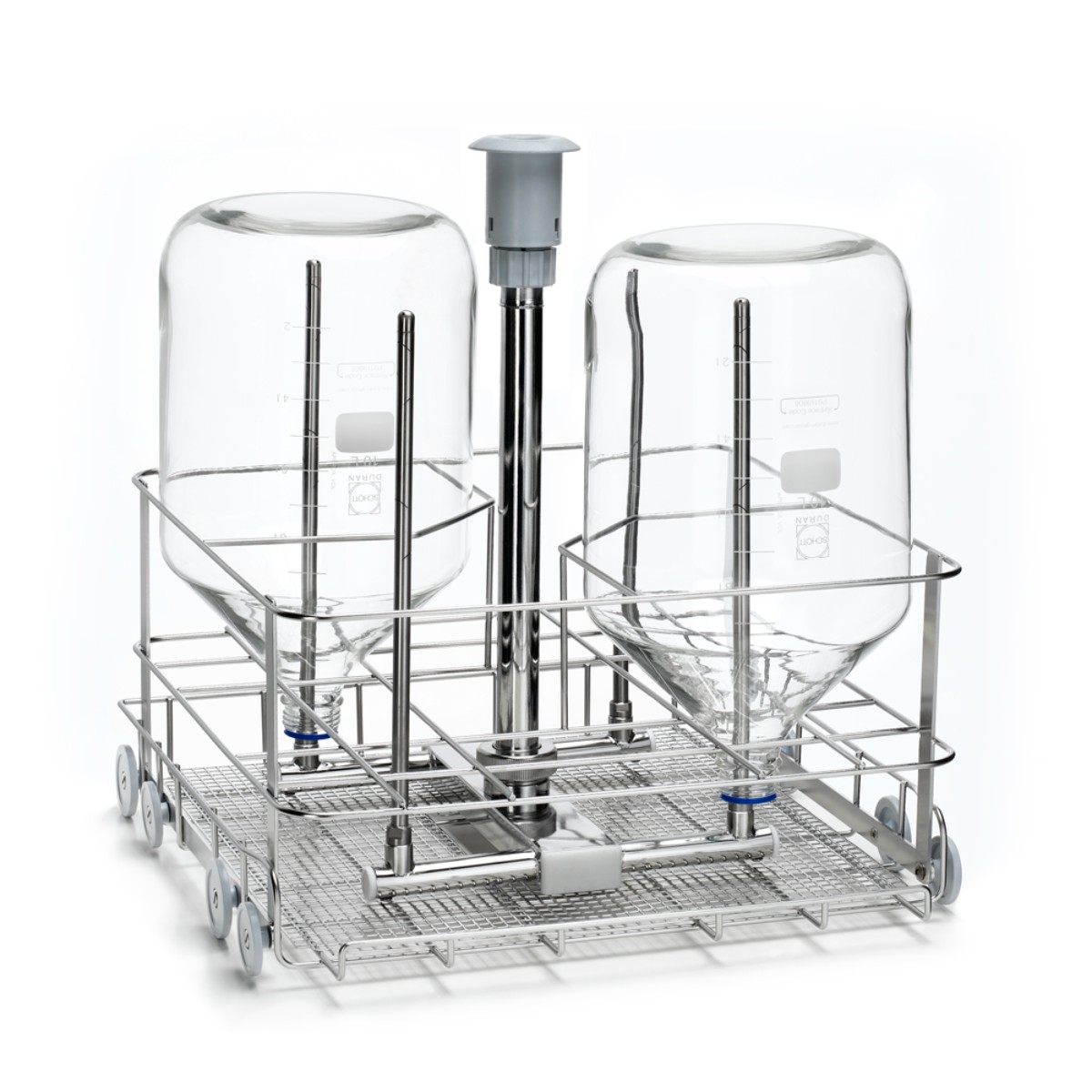 Данная модель ориентирована на мойку колб Эрленмейера и бутылок объемом от 5 до 10 литров, которые не могут быть обработаны в стандартных загрузочных модулях из-за своих крупных габаритов. Вставка рассчитана на 4 позиции, что позволяет одновременно мыть до четырех таких крупных емкостей за один цикл. Несмотря на небольшое количество позиций, каждая емкость требует значительного пространства, и четыре позиции являются оптимальным количеством для эффективного использования внутреннего объема моечной камеры.