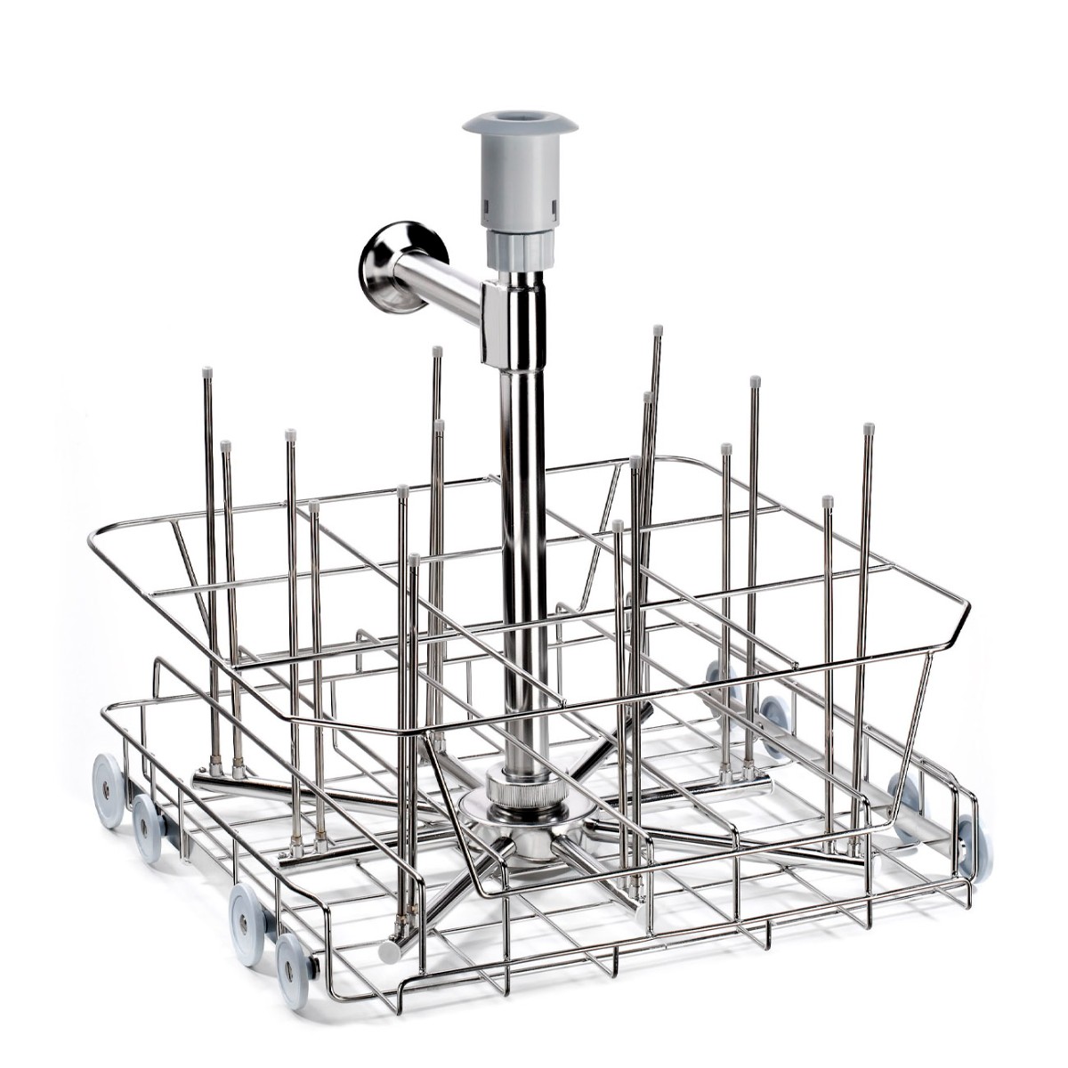 Вставка рассчитана на 16 позиций, что позволяет одновременно мыть до шестнадцати крупных емкостей за один цикл, существенно экономя время и повышая производительность лаборатории. Вставка позиционируется на нижнем уровне моечной камеры, что обеспечивает устойчивость при загрузке тяжелых бутылей и оптимальное распределение веса. Такое расположение также гарантирует, что мощные струи воды от нижнего разбрызгивателя эффективно достигают всех поверхностей крупной посуды.