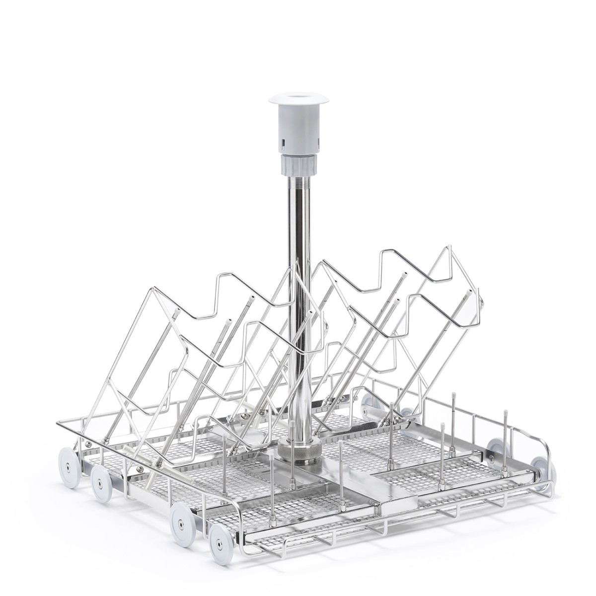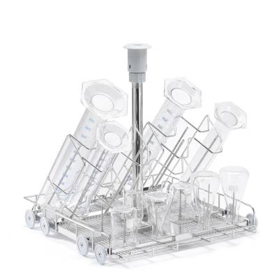 Данная модель оснащена рамкой с изгибами (посадочными местами), которые предназначены для размещения мерных цилиндров в процессе мойки, и инжекционными соплами, которые обеспечивают направленную подачу моющего раствора под давлением непосредственно во внутреннюю полость каждого мерного цилиндра, гарантируя тщательное удаление загрязнений с внутренних стенок и дна. В целом, имеется 16 мест для размещения лабораторныхз емкостей. Модуль позиционируется на нижнем уровне моечной камеры, что обеспечивает устойчивость при загрузке высоких мерных цилиндров и оптимальное распределение веса.