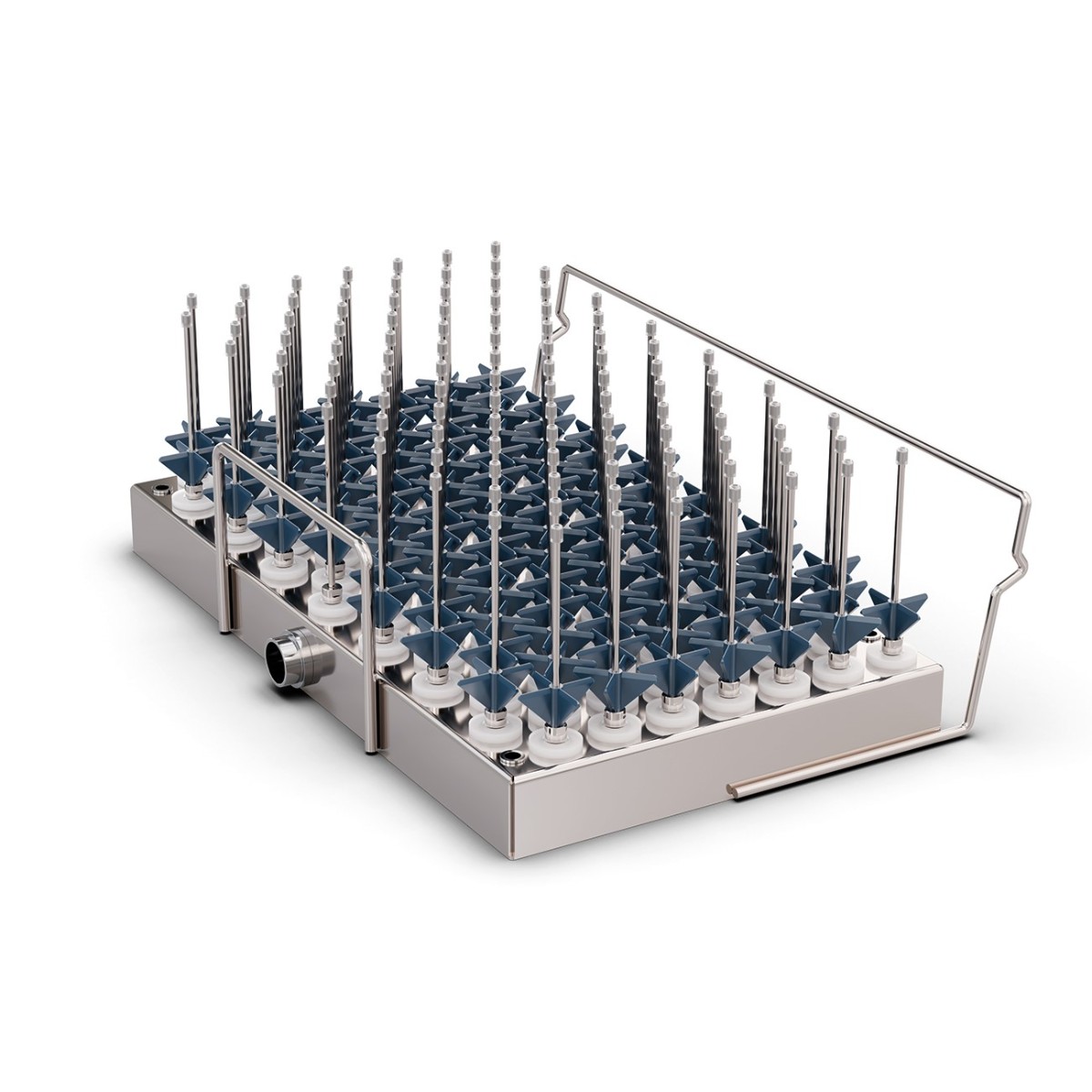 Модуль оснащен 105 инжекционными соплами модели U390 длиной 90 мм, которые обеспечивают направленную подачу моющего раствора непосредственно во внутреннюю полость каждой очищаемой единицы посуды. Такая конструкция гарантирует тщательное удаление загрязнений даже из узких и глубоких пробирок и флаконов.