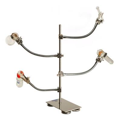 Закругленные лапки с силиконовым покрытием гарантируют бережный и надежный захват, предотвращая повреждение поверхностей и обеспечивая равномерное распределение давления. Благодаря регулируемому механизму, диаметр захвата плавно изменяется в диапазоне от 0 до 20 мм, что позволяет работать с посудой малого размера, включая реторты, узкие колбы и другое оборудование.