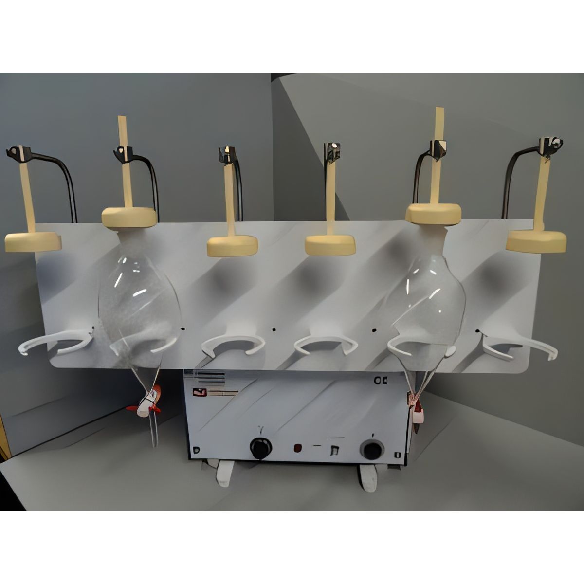 Принцип действия: Оператор закрепляет до шести грушевидных колб объёмом 250 или 500 мл на вертикальной опорной плите. Прибор совершает качательные движения с амплитудой ±45°, обеспечивая интенсивное, но контролируемое перемешивание фаз. Благодаря бесступенчатой регулировке скорости в диапазоне 30–120 циклов/мин оператор может подобрать оптимальный режим для каждой конкретной пары жидкостей.