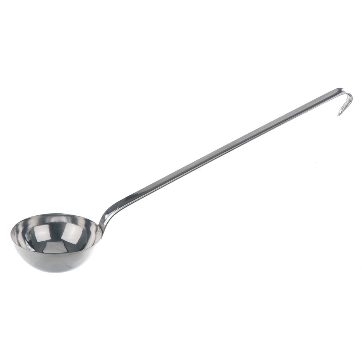 Прямая ручка длиной 315 мм обеспечивает комфортную работу с емкостями различной глубины, а крючок на конце позволяет фиксировать инструмент на краях сосудов или подвешивать для хранения. Ковш диаметром 90 мм и объемом 150 мл оптимизирован для точного дозирования. Полированная поверхность упрощает очистку и предотвращает адгезию материалов.