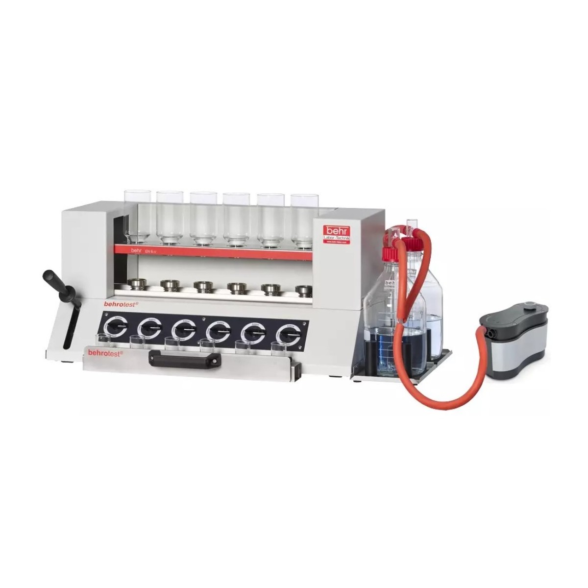 Behr behrotest EN 6-V — это фильтровальное устройство для автоматизации и ускорения ключевой завершающей стадии этих методов — фильтрации и промывки. Она выполняет заключительную фазу: стеклянные воронки облегчают подачу обработанных образцов и растворителей, а функция вакуумирования ускоряет фильтрацию и промывку.