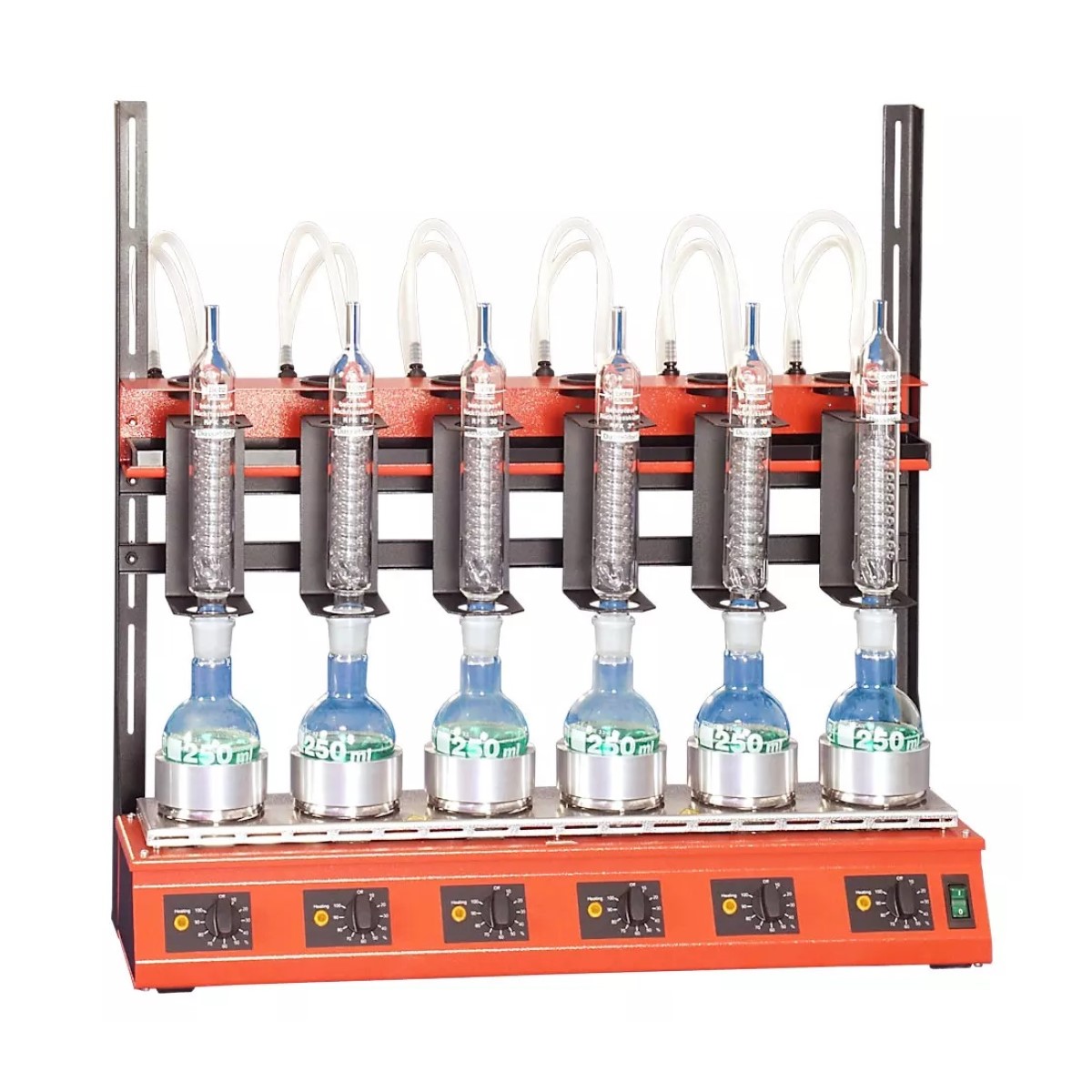 В комплектацию также входят ячейка (блок) для осадка, опорные стержни для сборки устойчивой рамы, система распределения охлаждающей воды с консолью для крепления конденсаторов и держателями, а также сосуды для разложения объёмом 250 мл и высокопроизводительные конденсаторы. Данная конфигурация делает аппарат готовым решением для эффективной и воспроизводимой пробоподготовки на этапе кислотного гидролиза перед последующим фотометрическим определением концентрации гидроксипролина, что критически важно для контроля качества и выявления фальсификации мясной продукции.