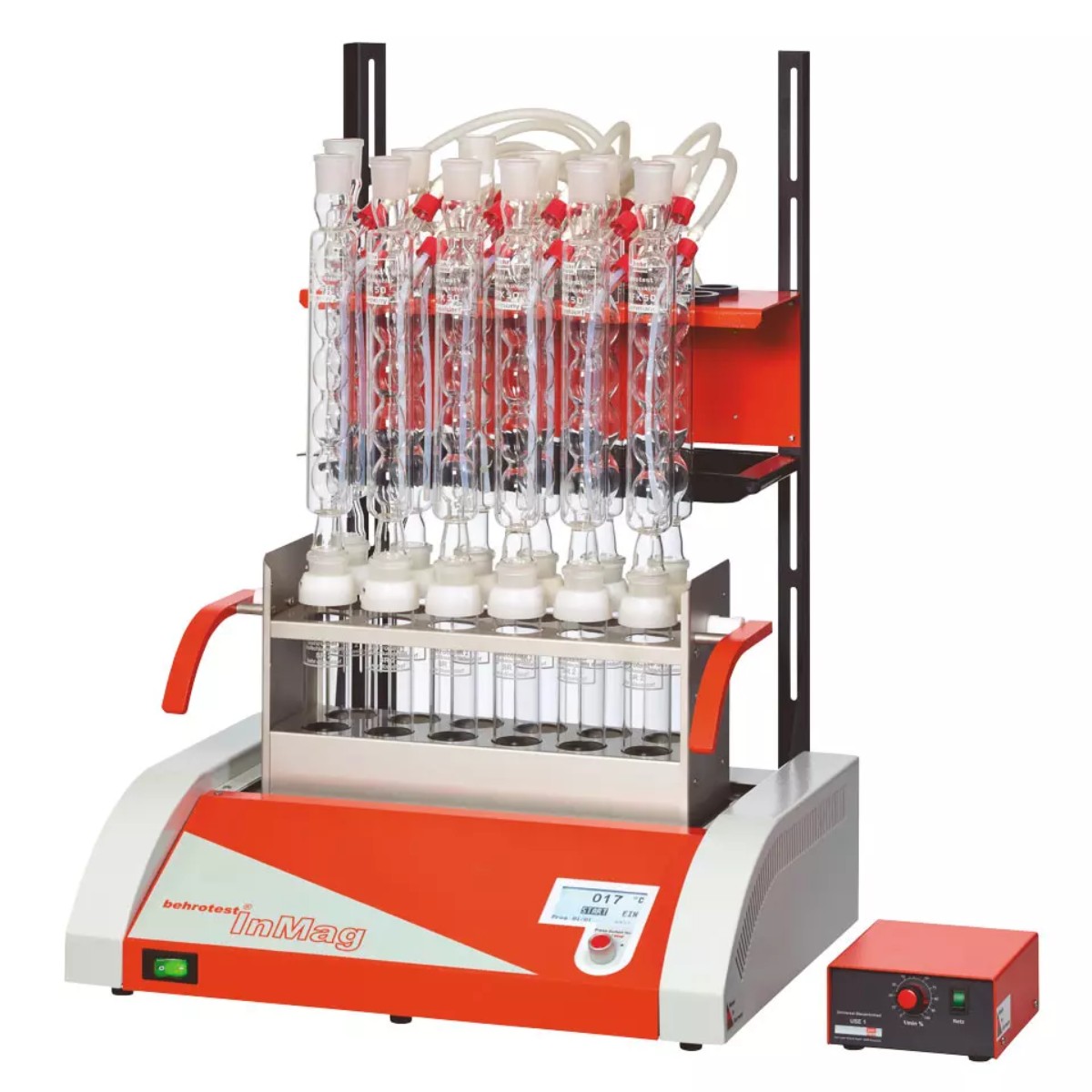 Дистилляционный аппарат Behr behrotest VFZ 12 представляет собой полностью программируемую 12-позиционную систему для одновременного определения числа омыления в 12 образцах жиров и масел в соответствии со стандартными методиками. Установка состоит из 12 круглых сосудов для разложения SR 2 объёмом 250 мл со стандартным шлифом NS 29 и уплотнительными кольцами из химически стойкого поливинилиденфторида, смонтированных на компактной стойке с интегрированной рамой для охлаждения и надёжными держателями.